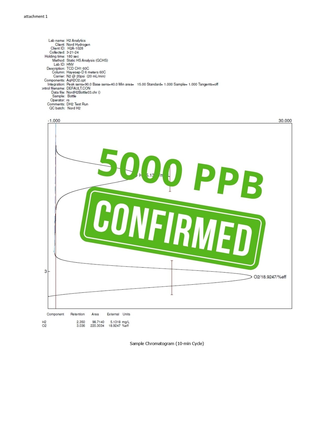 Här ser du en gas-kromatografisk analys från H₂ Analytics, där vi verifierar koncentrationen av molekylärt väte i Nord Hydrogen-flaskan. Denna avancerade metod mäter exakt hur mycket H₂ som produceras, och som du kan se i diagrammet – vi når 5000 PPB. Det bekräftar att flaskan levererar en stabil och säker nivå av väte, helt utan oönskade biprodukter som ozon eller fluorid. Vetenskapligt testat, garanterat rent.
