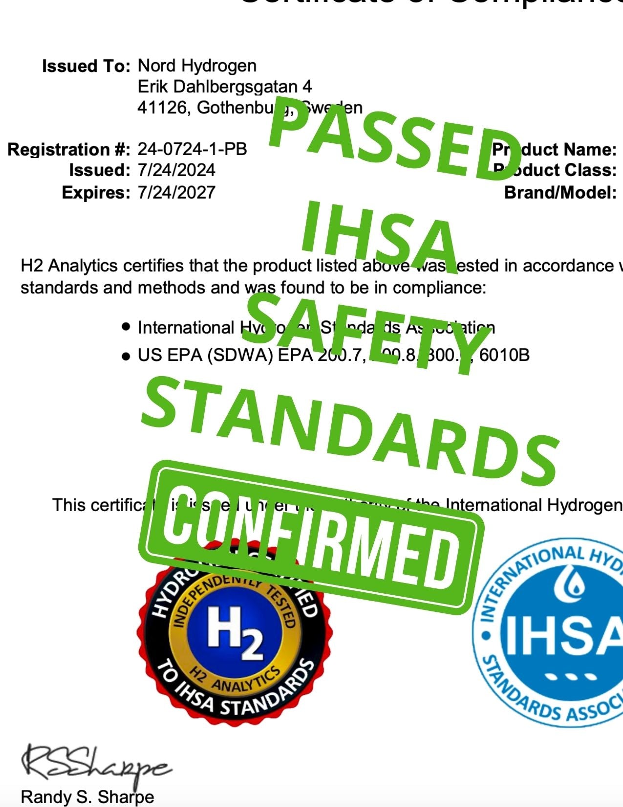 Nord Hydrogen-flaskan är godkänd enligt IHSA (International Hydrogen Standards Association), en organisation som säkerställer att produkter med molekylärt väte möter strikta kvalitets- och säkerhetskrav.
