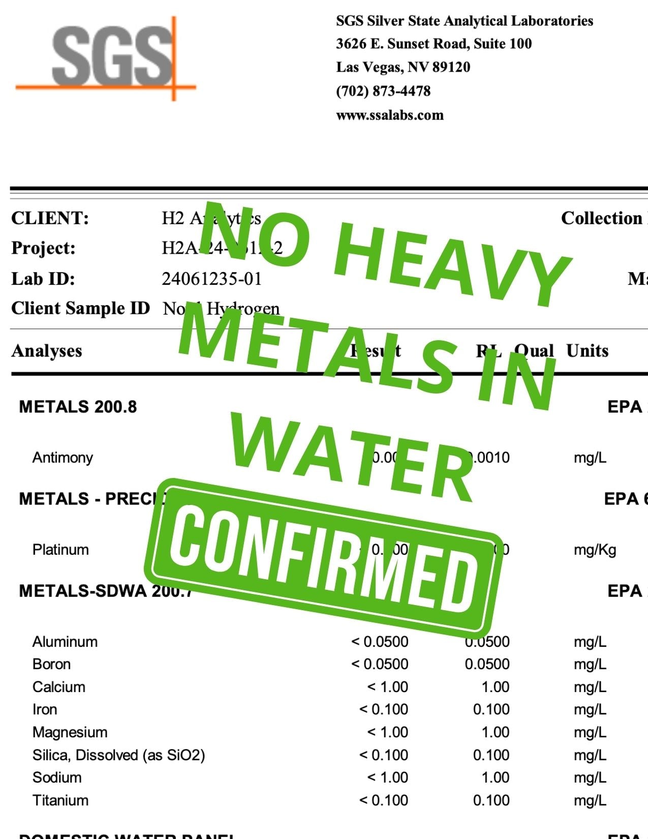 Här ser du resultatet från en vattenanalys utförd av SGS, där vi testar Nord Hydrogen-flaskan för eventuella tungmetaller. Analysen visar att vattnet är fritt från bly, kvicksilver, arsenik och andra skadliga metaller, vilket bekräftar att flaskan håller högsta säkerhetsstandard. Du får rent och säkert väteberikat vatten – utan kompromisser.