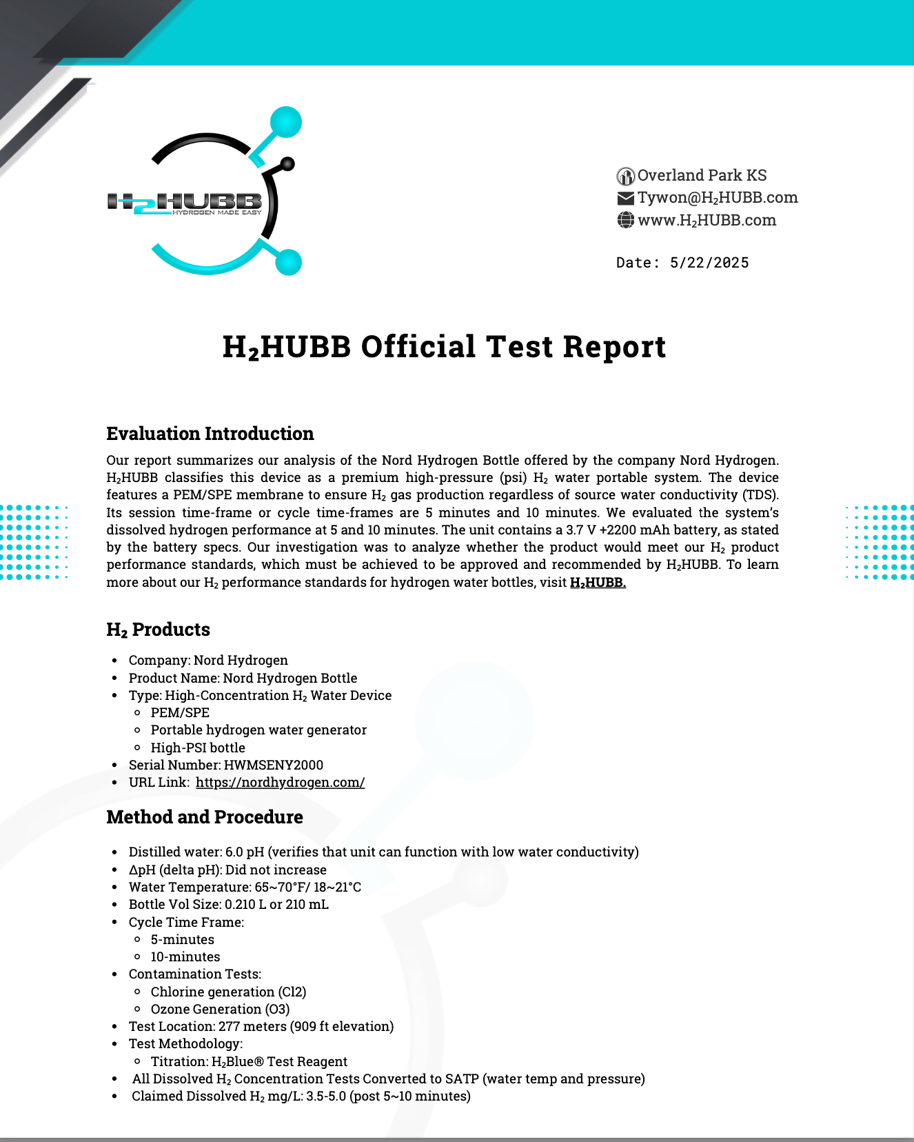 "The Nord Hydrogen Bottle stands among the safest hydrogen water bottles currently on the market, having undergone nearly every major safety evaluation applicable to this category."
