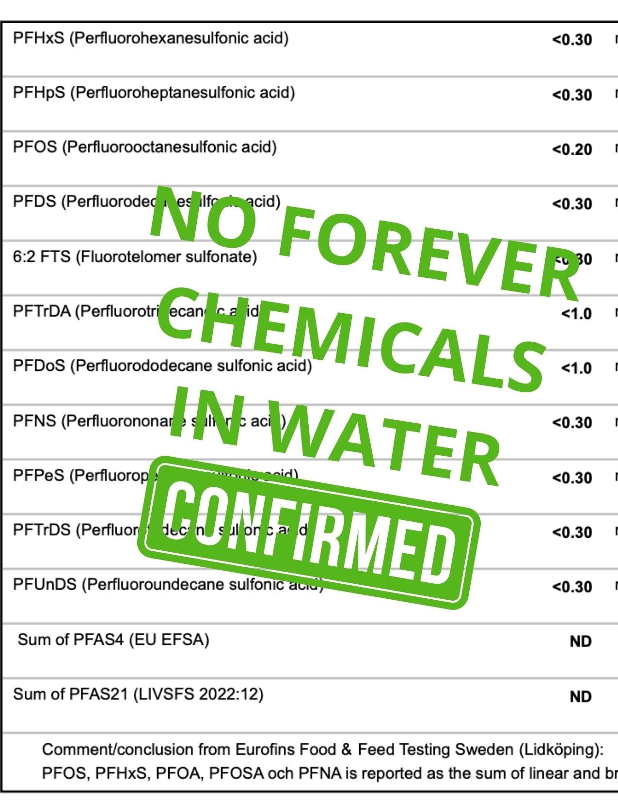 För att säkerställa att Nord Hydrogen-flaskan ger rent och säkert vatten, lät vi Eurofins utföra en PFAS-analys. Resultatet? Inga mätbara nivåer av PFAS, de så kallade "evighetskemikalierna". Med andra ord – vattnet du dricker är fritt från dessa skadliga ämnen och håller högsta möjliga renhetsstandard.